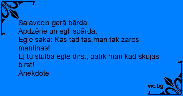 Salavecis garā bārda,<br />Apdzērie un egli spārda,<br />Egle saka: Kas tad tas,man tak zaros mantinas!<br />Ej tu stūlbā egle dirst, patīk man kad skujas birst!<br />Anekdote