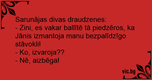 - Zini, es vakar ballītē tā piedzēros, ka Jānis izmantoja manu bezpalīdzīgo stāvokli!
