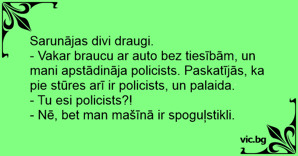 - Vakar braucu ar auto bez tiesībām, un mani apstādināja policists. Paskatījās, ka pie stūres arī ir policists, un palaida.