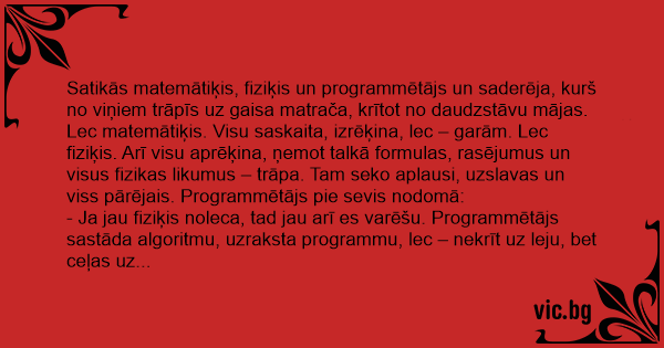 - Ja jau fiziķis noleca, tad jau arī es varēšu. Programmētājs sastāda algoritmu, uzraksta programmu, lec – nekrīt uz leju, bet ceļas uz augšu, lido un lamājas: