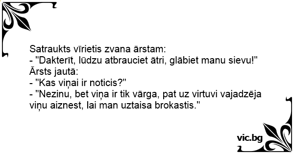 - "Dakterīt, lūdzu atbrauciet ātri, glābiet manu sievu!"