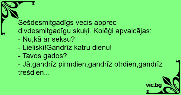 Un tip de 60 ani s-a căsătorit cu o tipă de 20. Colegii de lucru îl întreabă: - Cum stai cu sexul? - Aproape în fiecare zi. Aproape luni, aproape marţi, aproape miercuri...