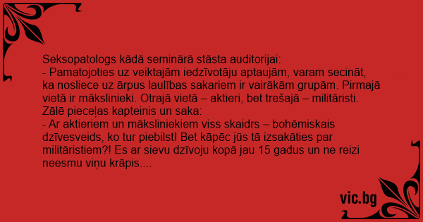 - Ar aktieriem un māksliniekiem viss skaidrs – bohēmiskais dzīvesveids, ko tur piebilst! Bet kāpēc jūs tā izsakāties par militāristiem?! Es ar sievu dzīvoju kopā jau 15 gadus un ne reizi neesmu viņu krāpis.