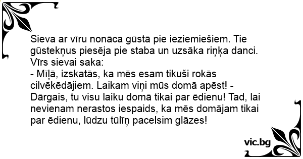 - Mīļā, izskatās, ka mēs esam tikuši rokās cilvēkēdājiem. Laikam viņi mūs domā apēst! - Dārgais, tu visu laiku domā tikai par ēdienu! Tad, lai nevienam nerastos iespaids, ka mēs domājam tikai par ēdienu, lūdzu tūlīņ pacelsim glāzes!