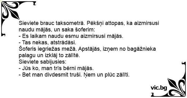 Sieviete brauc taksometrā. Pēkšņi attopas, ka aizmirsusi naudu mājās, un saka šoferim: