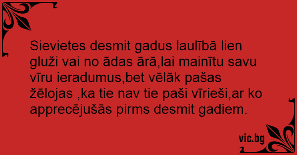 Sievietes desmit gadus laulībā lien gluži vai no ādas ārā,lai mainītu savu vīru ieradumus,bet vēlāk pašas žēlojas ,ka tie nav tie paši vīrieši,ar ko apprecējušās pirms desmit gadiem.