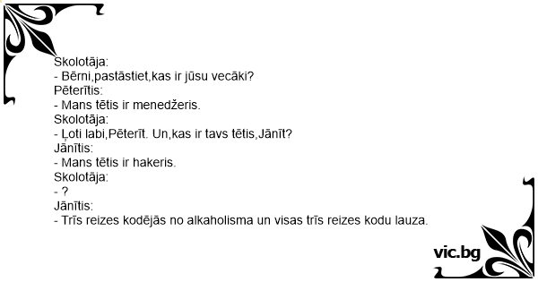 - Ļoti labi,Pēterīt. Un,kas ir tavs tētis,Jānīt?