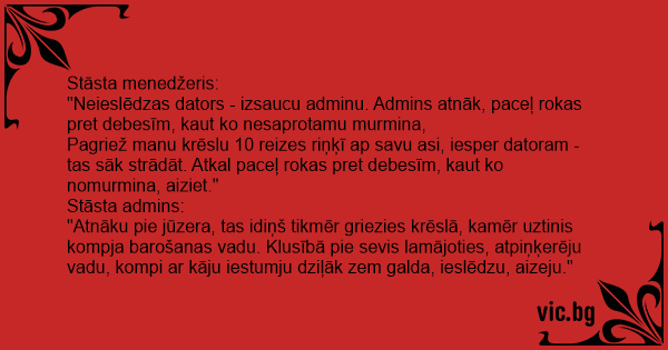 "Neieslēdzas dators - izsaucu adminu. Admins atnāk, paceļ rokas pret debesīm, kaut ko nesaprotamu murmina,