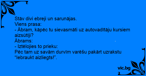 - Ābram, kāpēc tu sievasmāti uz autovadītāju kursiem aizsūtīji?