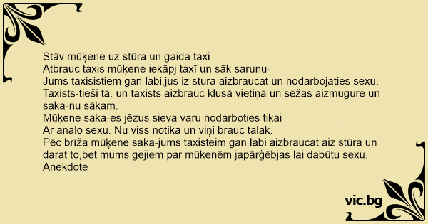 Taxists-tieši tā. un taxists aizbrauc klusā vietiņā un sēžas aizmugure un saka-nu sākam.