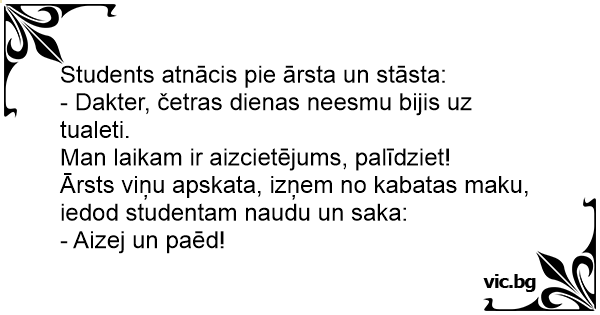 - Dakter, četras dienas neesmu bijis uz tualeti.