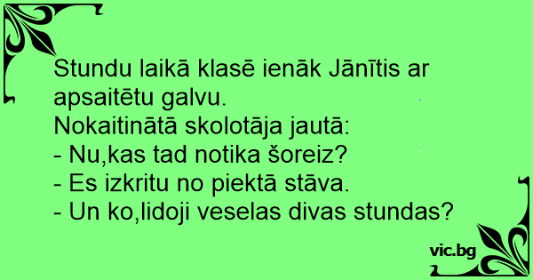 Stundu laikā klasē ienāk Jānītis ar apsaitētu galvu.