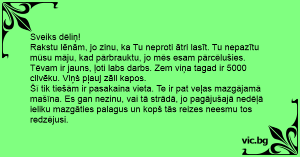 Rakstu lēnām, jo zinu, ka Tu neproti ātri lasīt. Tu nepazītu mūsu māju, kad pārbrauktu, jo mēs esam pārcēlušies. Tēvam ir jauns, ļoti labs darbs. Zem viņa tagad ir 5000 cilvēku. Viņš pļauj zāli kapos.