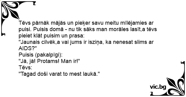 Tēvs pārnāk mājās un pieķer savu meitu mīlējamies ar puisi. Puisis domā - nu tik sāks man morāles lasīt,a tēvs pieiet klāt puisim un prasa: