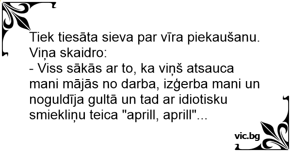 - Viss sākās ar to, ka viņš atsauca mani mājās no darba, izģerba mani un noguldīja gultā un tad ar idiotisku smiekliņu teica "aprill, aprill"...