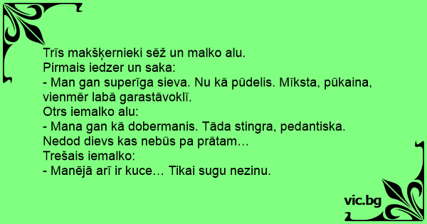 - Man gan superīga sieva. Nu kā pūdelis. Mīksta, pūkaina, vienmēr labā garastāvoklī.