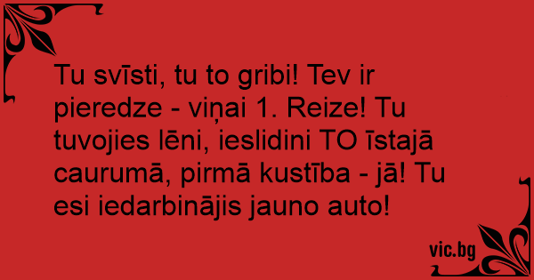 Tu svīsti, tu to gribi! Tev ir pieredze - viņai 1. Reize! Tu tuvojies lēni, ieslidini TO īstajā caurumā, pirmā kustība - jā! Tu esi iedarbinājis jauno auto!