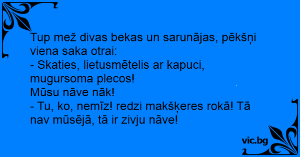 Tup mež divas bekas un sarunājas, pēkšņi viena saka otrai: