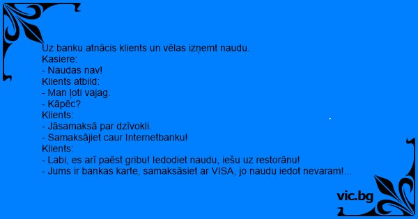 - Jums ir bankas karte, samaksāsiet ar VISA, jo naudu iedot nevaram!