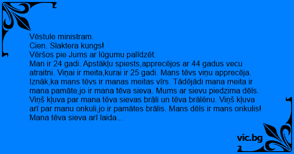 Man ir 24 gadi. Apstākļu spiests,apprecējos ar 44 gadus vecu atraitni. Viņai ir meita,kurai ir 25 gadi. Mans tēvs viņu apprecēja. Iznāk,ka mans tēvs ir manas meitas vīrs. Tādējādi mana meita ir mana pamāte,jo ir mana tēva sieva. Mums ar sievu piedzima dēls. Viņš kļuva par mana tēva sievas brāli un tēva brālēnu. Viņš kļuva arī par manu onkuli,jo ir pamātes brālis. Mans dēls ir mans onkulis!Mana tēva sieva arī laida pasaulē dēliņu. Viņš uzreiz kļuva par manu brāli,jo ir mana tēva dēls,un mans mazdēls,jo ir manas sievas dēls. Iznāk,ka esmu savas sievas brālis,jo esmu sava dēla brālis. Galu galā iznāk,ka esmu pats sev vectēvs.