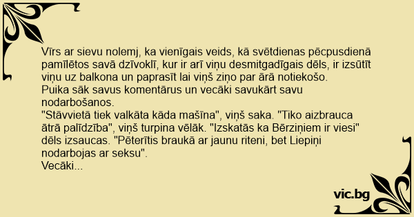 "Stāvvietā tiek valkāta kāda mašīna", viņš saka. "Tiko aizbrauca ātrā palīdzība", viņš turpina vēlāk. "Izskatās ka Bērziņiem ir viesi" dēls izsaucas. "Pēterītis braukā ar jaunu riteni, bet Liepiņi nodarbojas ar seksu".