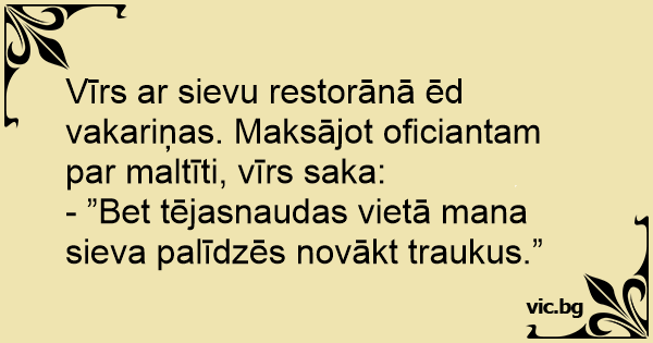 Vīrs ar sievu restorānā ēd vakariņas. Maksājot oficiantam par maltīti, vīrs saka: