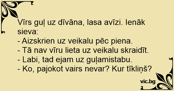 Vīrs guļ uz dīvāna, lasa avīzi. Ienāk sieva: