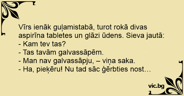 Vīrs ienāk guļamistabā, turot rokā divas aspirīna tabletes un glāzi ūdens. Sieva jautā: