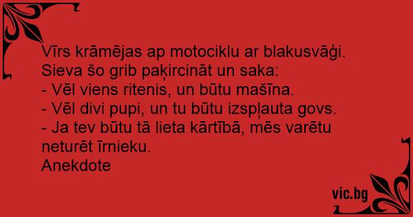 Vīrs krāmējas ap motociklu ar blakusvāģi. Sieva šo grib paķircināt un saka: