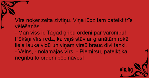 - Velns, - nolamājas vīrs. - Piemirsu, pateikt,ka negribu to ordeni pēc nāves!