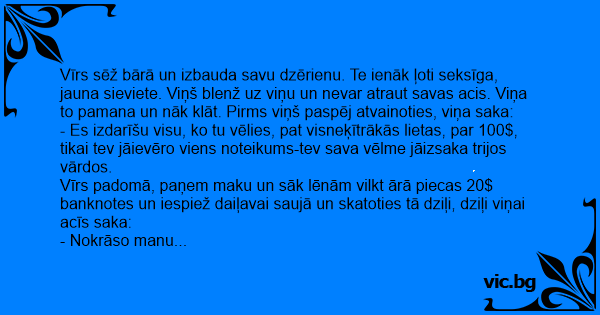 Vīrs padomā, paņem maku un sāk lēnām vilkt ārā piecas 20$ banknotes un iespiež daiļavai saujā un skatoties tā dziļi, dziļi viņai acīs saka:
