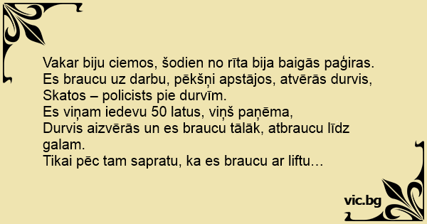 Es braucu uz darbu, pēkšņi apstājos, atvērās durvis,