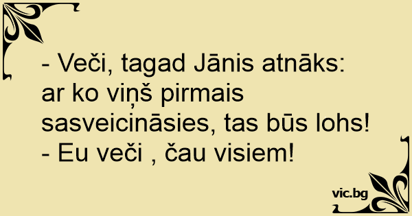 - Veči, tagad Jānis atnāks: ar ko viņš pirmais sasveicināsies, tas būs lohs! - Eu veči , čau visiem!