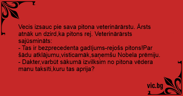 Vecis izsauc pie sava pitona veterinārārstu. Ārsts atnāk un dzird,ka pitons rej. Veterinārārsts sajūsmināts: