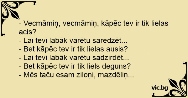 - Vecmāmiņ, vecmāmiņ, kāpēc tev ir tik lielas acis?