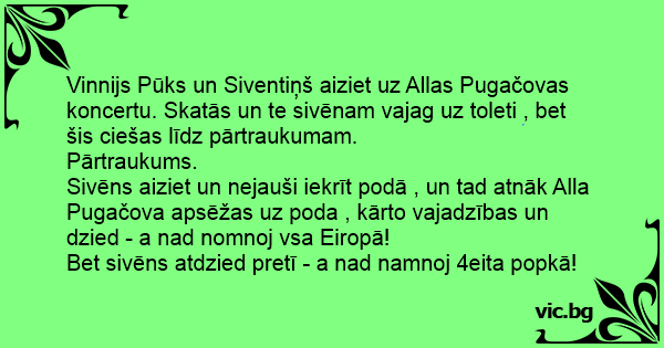 Vinnijs Pūks un Siventiņš aiziet uz Allas Pugačovas koncertu. Skatās un te sivēnam vajag uz toleti , bet šis ciešas līdz pārtraukumam.
