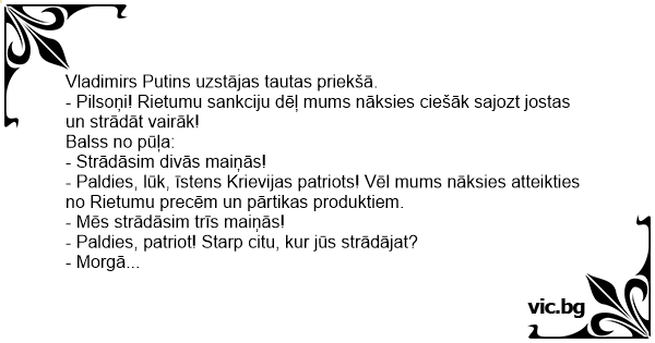 - Pilsoņi! Rietumu sankciju dēļ mums nāksies ciešāk sajozt jostas un strādāt vairāk!