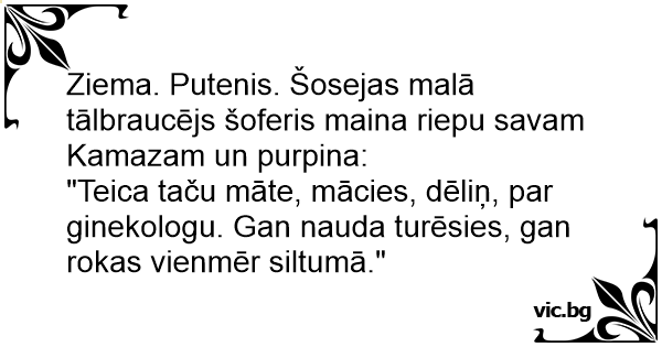 Ziema. Putenis. Šosejas malā tālbraucējs šoferis maina riepu savam Kamazam un purpina:
