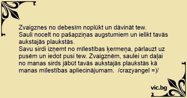 Savu sirdi izņemt no mīlestības ķermeņa, pārlauzt uz pusēm un iedot pusi tew. Zvaigznēm, saulei un daļai no manas sirds jābūt tavās aukstajās plaukstās kā manas mīlestības apliecinājumam. /crazyangel =)/