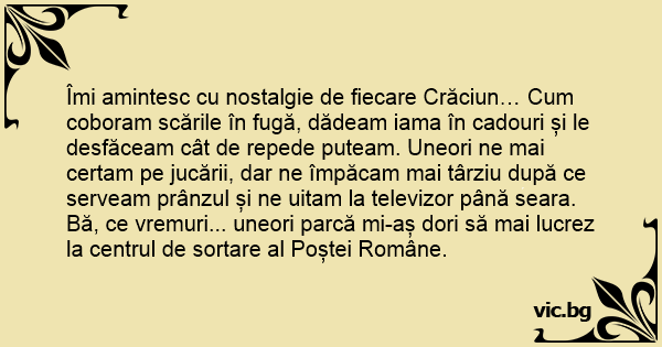 Îmi amintesc cu nostalgie de fiecare Crăciun… Сuм coboram scările în fugă, dădeam iama în cadouri și le desfăceam cât de repede puteam. Uneori ne mai certam pe jucării, dar ne împăcam mai târziu după ce serveam prânzul și ne uitam la televizor până seara.