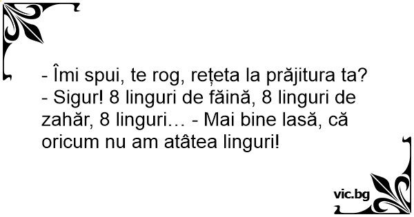 - Sigur! 8 linguri de făină, 8 linguri de zahăr, 8 linguri… - Mai bine lasă, că oricum nu am atâtea linguri!