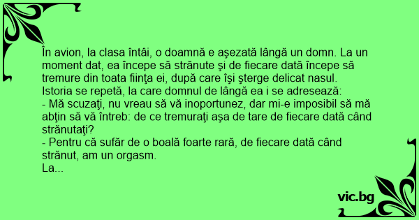 În avion, la clasa întâi, o doamnă e aşezată lângă un domn. La un moment dat, ea începe să strănute şi de fiecare dată începe să tremure din toata fiinţa ei, după care îşi şterge delicat nasul.
