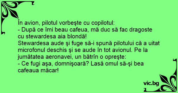 Stewardesa aude şi fuge să-i spună pilotului că a uitat microfonul deschis şi se aude în tot avionul. Pe la jumătatea aeronavei, un bătrîn o opreşte: