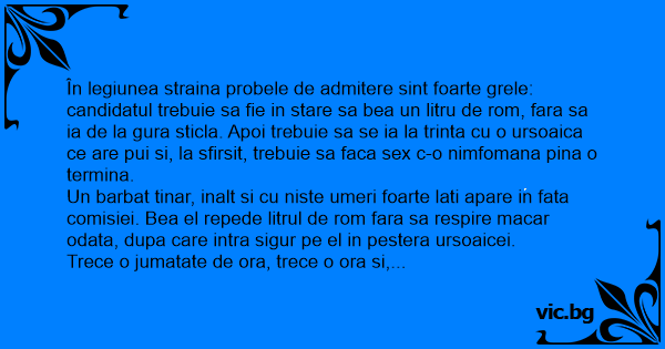 În legiunea straina probele de admitere sint foarte grele: candidatul trebuie sa fie in stare sa bea un litru de rom, fara sa ia de la gura sticla. Apoi trebuie sa se ia la trinta cu o ursoaica ce are pui si, la sfirsit, trebuie sa faca sеx c-o nimfomana pina o termina.
