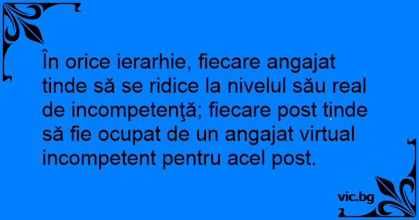 În orice ierarhie, fiecare angajat tinde să se ridice la nivelul său real de incompetenţă; fiecare post tinde să fie ocupat de un angajat virtual incompetent pentru acel post.
