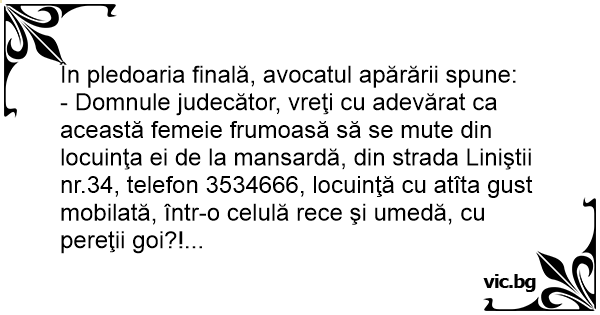 - Domnule judecător, vreţi cu adevărat ca această femeie frumoasă să se mute din locuinţa ei de la mansardă, din strada Liniştii nr.34, telefon 3534666, locuinţă cu atîta gust mobilată, într-o celulă rece şi umedă, cu pereţii goi?!...