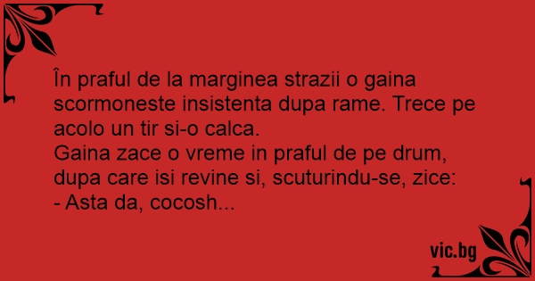 În praful de la marginea strazii o gaina scormoneste insistenta dupa rame. Trece pe acolo un tir si-o calca.