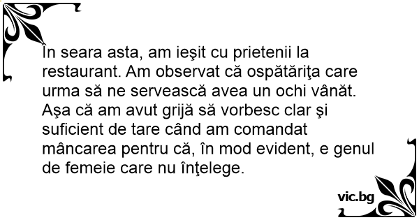 În seara asta, am ieşit cu prietenii la restaurant. Am observat că ospătăriţa care urma să ne servească avea un ochi vânăt. Aşa că am avut grijă să vorbesc clar şi suficient de tare când am comandat mâncarea pentru că, în mod evident, e genul de femeie care nu înţelege.