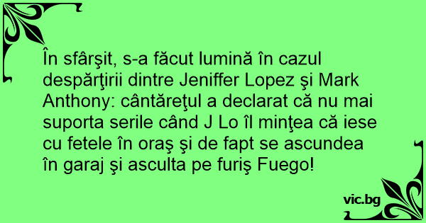 În sfârşit, s-a făcut lumină în cazul despărţirii dintre Jeniffer Lopez şi Mark Anthony: cântăreţul a declarat că nu mai suporta serile când J Lo îl minţea că iese cu fetele în oraş şi de fapt se ascundea în garaj şi asculta pe furiş Fuego!
