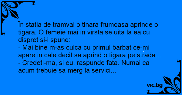 În statia de tramvai o tinara frumoasa aprinde o tigara. O femeie mai in virsta se uita la ea cu dispret si-i spune: